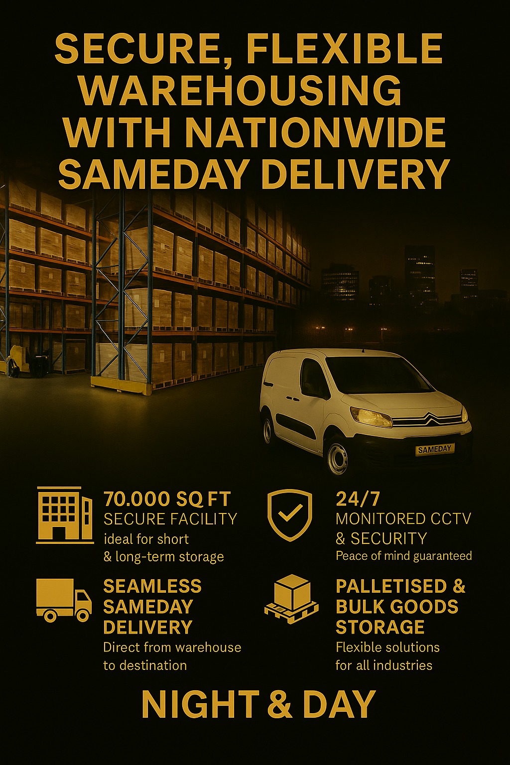Combined with our nationwide same-day courier fleet, we deliver a complete end-to-end logistics service — from storage to delivery, all handled under one trusted name.